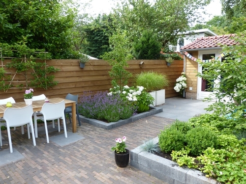 De oude schuur was door de bewoners al vervangen voor een nieuw exemplaar, ‘the man cave’ genoemd, met openslaande deuren om goed toegang aan de motor te verlenen. In de rest van de tuin moest ook rekening gehouden worden met een praktische doorloop met de motor. Dat betekende relatief veel verharding waardoor weinig ruimte over bleef voor gazon. Maar dat was ook niet nodig, vonden de bewoners. Afwisseling in de bestrating zorgt evengoed voor een gezellige uitstraling. Twee grote verhoogde borders delen de tuin in tweeën. Bij de woning ligt een terras met een eettafel en een buitenkeuken van betonnen U-elementen. Achter in de tuin ligt een lounge terras, mèt de zo begeerde gestucte verhoogde border met geïntegreerd bankje.