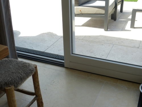 Het terras is van dezelfde tegels gelegd als de tegels binnen. In het echt ziet het er nog mooier uit dan op de foto. Dit terras zal nog een houten veranda krijgen met glazen dak. Rondom het terras en langs de woning ligt kunstgras. Zo droog dus ideaal voor de honden en de jongens om op te rennen. De rij olijfbomen voor de zwarte schutting komt schitterend uit en ook de boomgaard met een boomschors ondergrond is zeer fraai geworden naast de oude beuk in het grind.