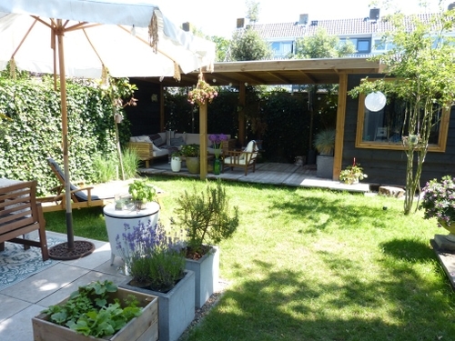 Of de tuin ruim een jaar na aanleg nog aan de verwachtingen voldeed en of ik nog eens langs mocht komen om foto’s te maken was mijn vraag. Blij verrast was ik toen ik deze gezellig ingerichte tuin aantrof. Toen de heer des huizes mij ontving moet hij mijn verwonderde blik over zijn styling kwaliteiten gezien hebben, aangezien hij direct nonchalant zei dat zijn vrouw dat aan het begin van het seizoen gedaan had en dat alles eigenlijk altijd buiten blijft liggen. Dan is de drempel om naar buiten te gaan wel heel laag.
